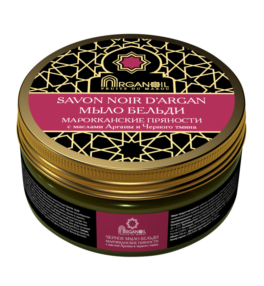 Средство косметическое гигиеническое моющее марки "ARGANOIL" серии "Fruits du Maroc": Марокканское черное мыло Бельди с маслами арганы и черного тмина "Марокканские пряности"