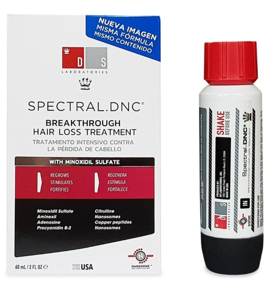 Формула содержит антиоксиданты направленного действия против свободных радикалов, улучшает циркуляцию крови в коже головы, позволяет блокировать ДПГ и бороться с вредными бактериями. Это хорошее доказательство того, что Миноксидил и Аминексил SP94 являются эффективными помощниками в деле оздоровления и придания силы волосам. DS Laboratories разработало наносомы, выступающие в качестве переносчиков полезных веществ в пункт назначения. Эти наносомы в 10 раз меньше чем клетки, что позволяет им проникать глубоко в эпидермис, а затем в течение 12 часов освобождать, содержащиеся внутри них растительные экстракты. Наносомы проникают гораздо глубже в фолликулу волоса, нежели аналогичные вещества, такие как третиноин и азелаиновая кислота, тем самым обеспечивая наилучшее действие всех активных компонентов Spectral DNC®.